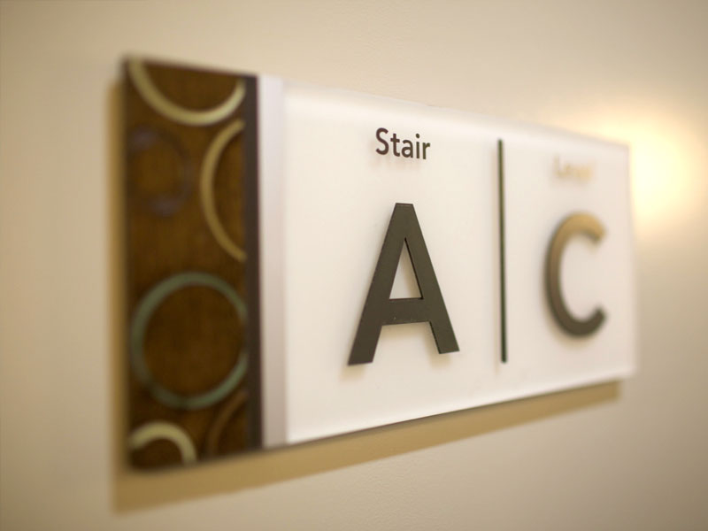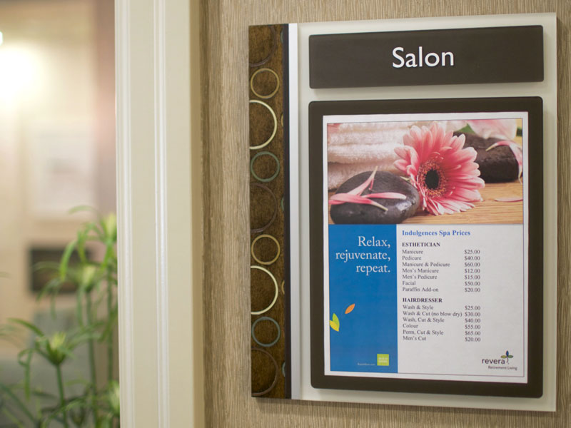 We worked closely with the new owners’ Interior Designer to develop a look that was truly reflective of the residence. We removed existing signage without damaging wallpaper that was being retained, as well as from walls that had to be repainted. We replaced outdated whiteboards with new Activity Boards and Elevator Boards. Using the flooring as inspiration to ground the signage, our design incorporated laser cut acrylic embedded in wood (yes, this was definitely a challenge!) to manufacture 300 new and replacement signage for 3 separate installations.